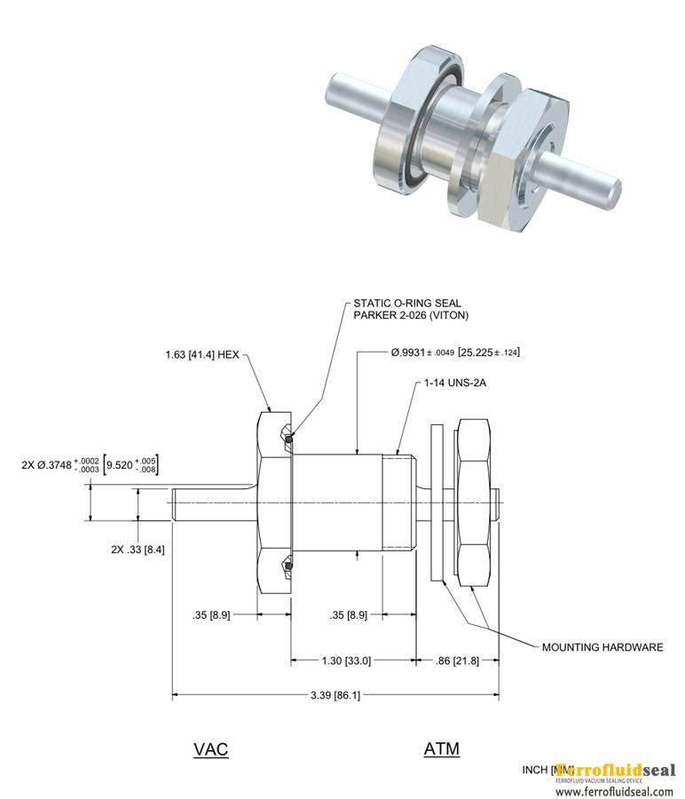 The USS-375-SLBE vacuum rotary feedthrough features a Solid shaft with Nut Mounted (threaded body) mounting. Dimensional details are specified below. For precision measurement specifications, refer to the Spec Control Drawing.