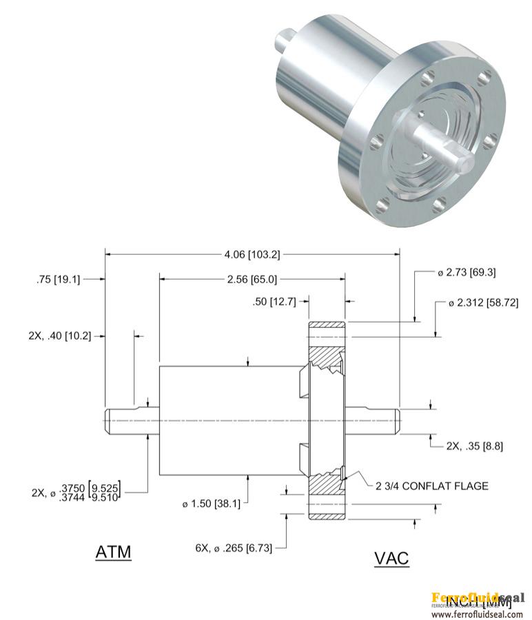 The SS-375-SLCB vacuum rotary feedthrough features a Solid shaft with ConFlat Flange mounting. Dimensional details are specified below. For precision measurement specifications, refer to the Spec Control Drawing.