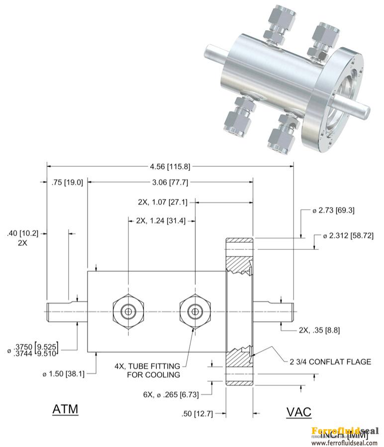 The SS-375-SLCBW vacuum rotary feedthrough features a Solid shaft with ConFlat Flange mounting. Dimensional details are specified below. This vacuum seal is also water-cooled for high-temperature applications. For precision measurement specifications, refer to the Spec Control Drawing.
