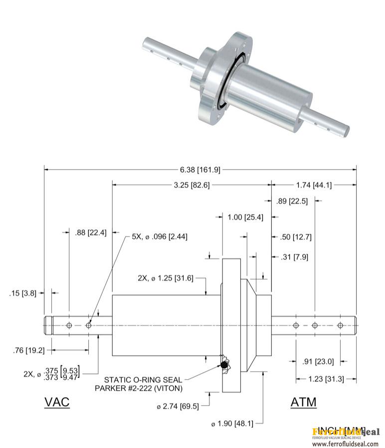 The SS-375-SLES vacuum rotary feedthrough features a Solid shaft with Custom mounting. Dimensional details are specified below. For precision measurement specifications, refer to the Spec Control Drawing.